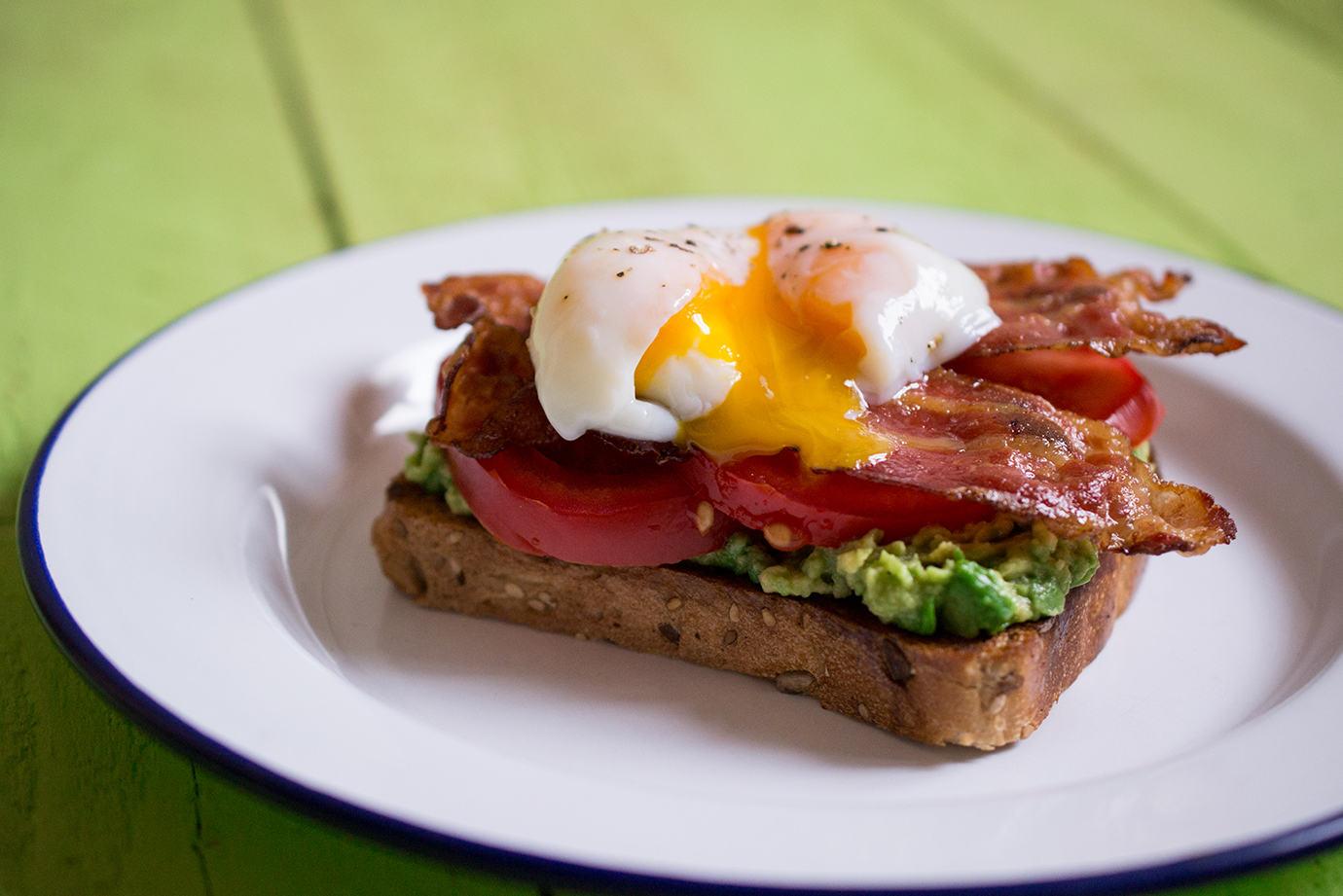 Tálaljunk: tegyük a pirítóst egy tányérra, kenjük meg az avokádókrémmel, helyezzük rá a paradicsom szeleteket, a bacont és a legvégén a buggyantott tojást.