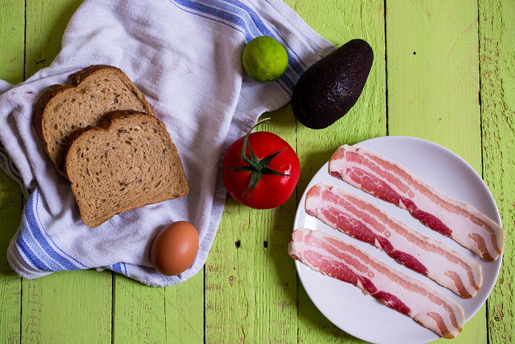 • 1 nagy tojás • 1 szelet kenyér • 1 érett avokádó • 1 lime (vagy citrom) • 1 paradicsom • 3 szelet bacon • só és bors