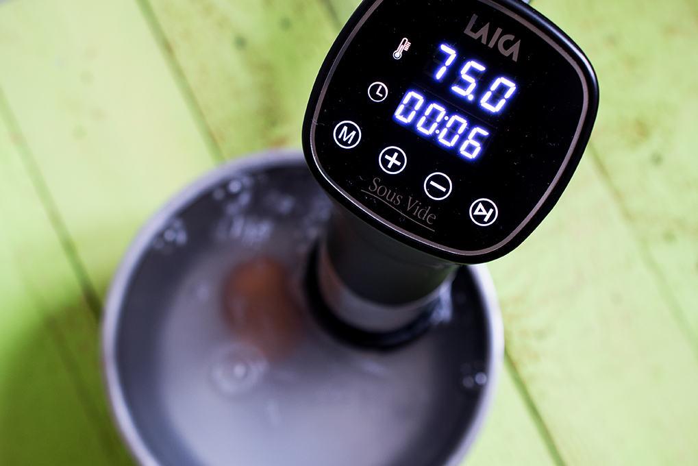 A buggyantott tojás elkészítéséhez mindenek előtt helyezzük a Sous vide szerkezetet egy vízzel teli lábosba és állítsuk be a hőmérsékletet 75 fokra, 12 perces főzési idővel. Amikor a Sous vide jelzi, hogy a víz stabilan elérte a megfelelő hőmérsékletet helyezzük bele finomat a tojást.