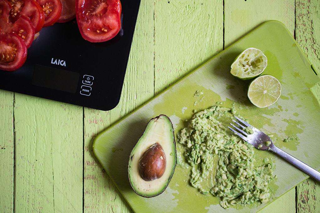 Eközben figyelhetünk a többi teendőre: mossuk meg a paradicsomot és vágjuk vékony szeletekre. Az avokádó krémhez felezzük el az avokádót, szedjük ki a magját, majd egy kanállal vágjuk ki a húsát és helyezzük egy tálba. Egy villával aprítsuk nagyobb darabokba majd adjuk hozzá a lime (vagy citrom) levét. Jól keverjük össze és tegyük félre későbbre.