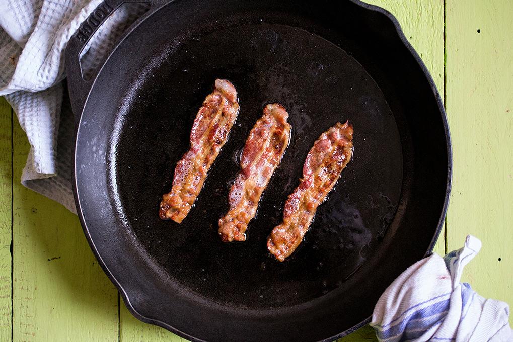 Magas lángon hevítsünk fel egy serpenyőt, tegyünk bele egy csepp olívaolajat, majd helyezzük bele a bacon szeleteket jól kifeszítve és pirítsuk őket illatosra mindkét oldalukon. Ha szeretnék karamellizálni egy kicsit a bacont, a sütés végén szórják meg egy kevés cukorral: még finomabb lesz tőle!