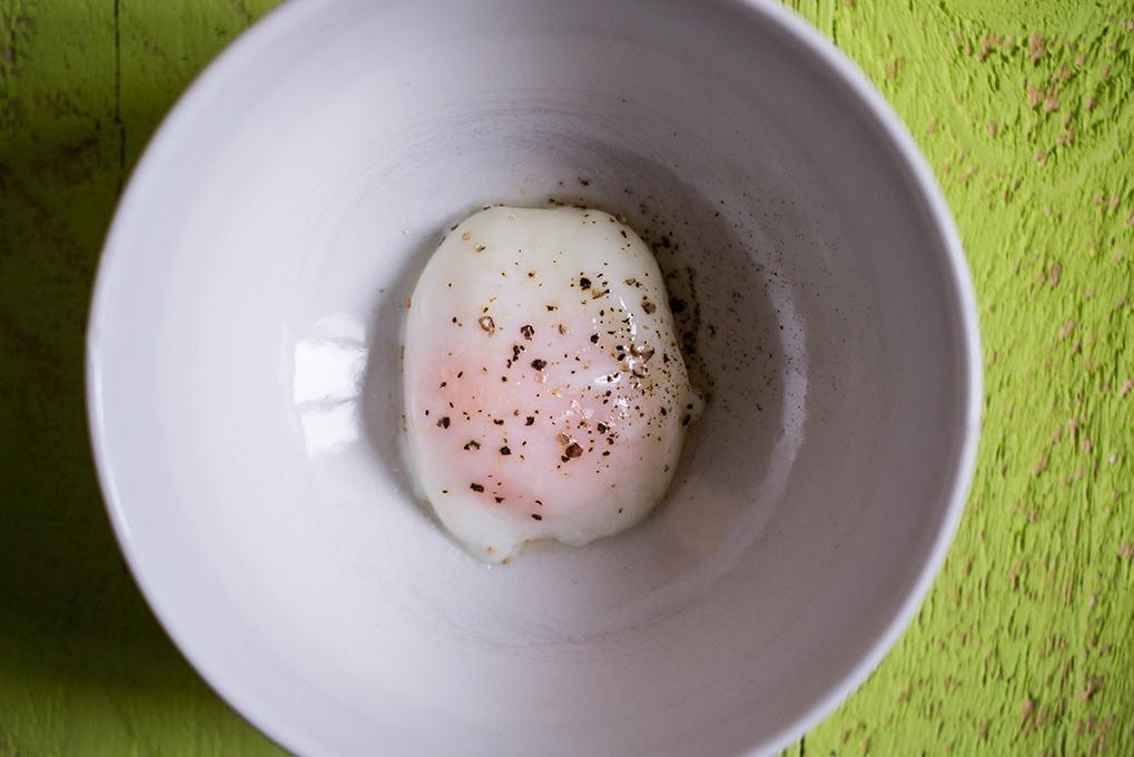 Ahogy a tojás rövid főzése befejeződik vegyük ki a forró vízből, majd helyezzük egy hideg vizes tálba egy percig pihenni. Törjük fel a héját finoman, mintha csak nyers lenne, majd sózzuk-borsozzuk meg a tojást.