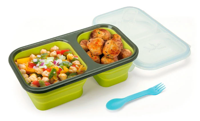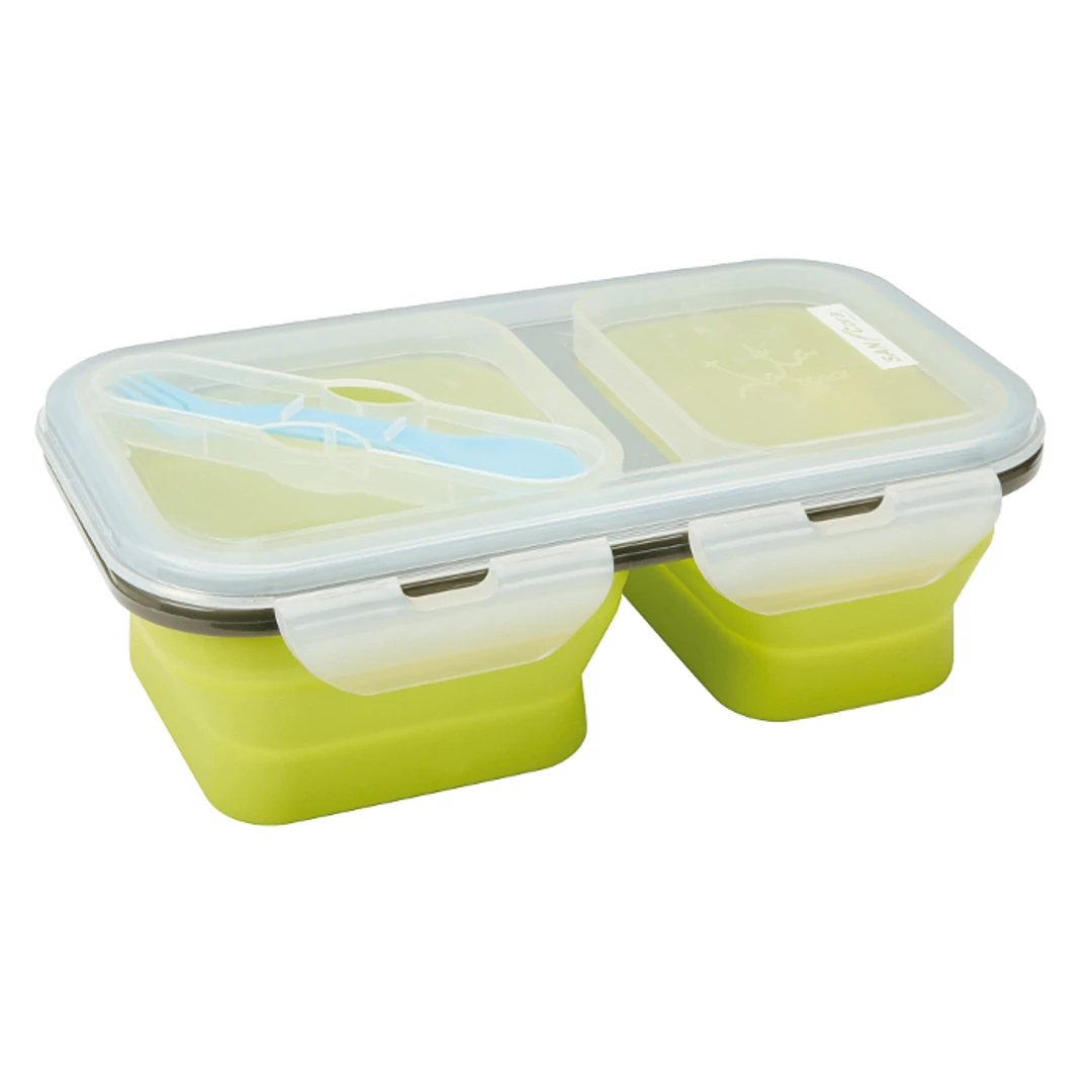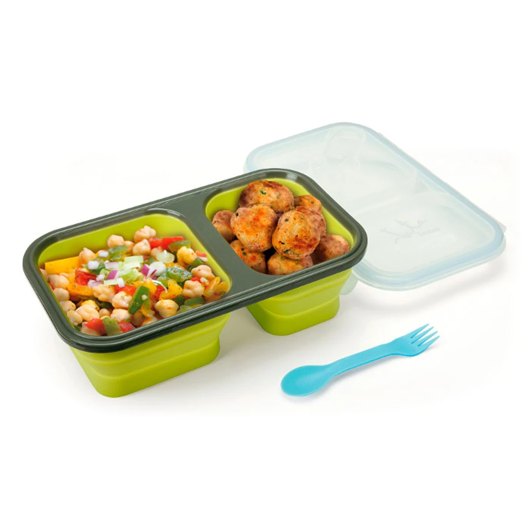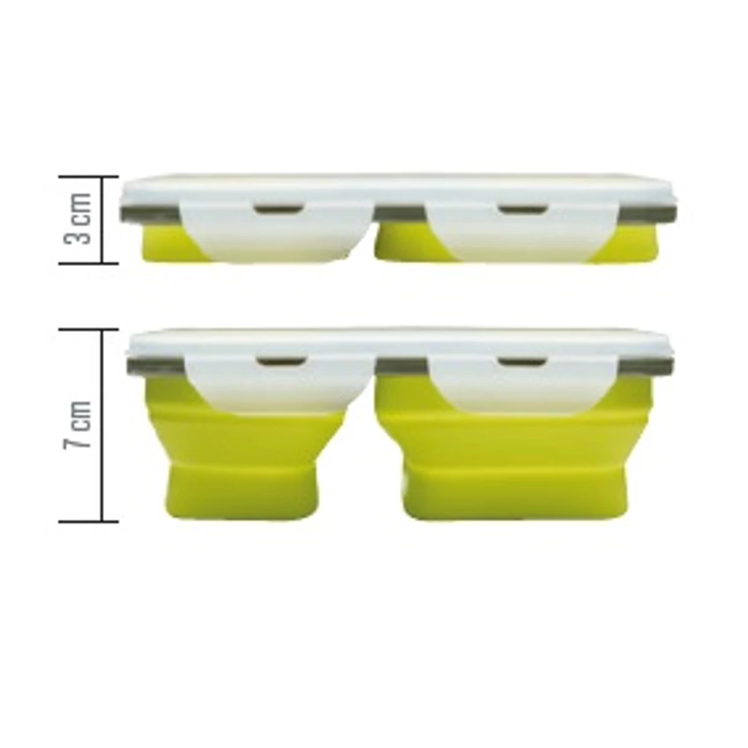 Praktikus szilikon anyagú, összenyomható ételtároló doboz osztott rekesszel. ► Dupla rekesz. Teljes kapacitás: 750 ml (450 ml + 300 ml) ► BPA mentes. ► Összenyomható: kis helyen tárolható. ► Frissen tartja az ételeidet. ► Higiénikus és egészséges, megfelel az LFGB szabványoknak. ► A doboz kiegészítője egy "villa-kanál". ► Mikrózható (+120°C) és fagyasztható (-40°C). ► Mosogatógépben mosható. ► Könnyen tisztítható.