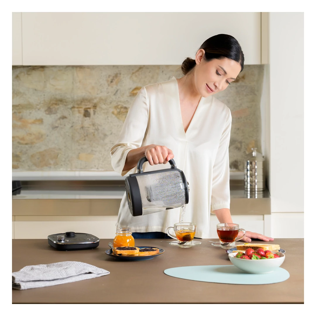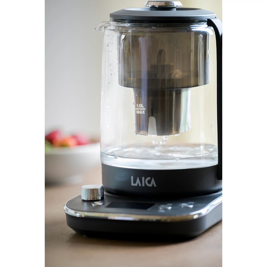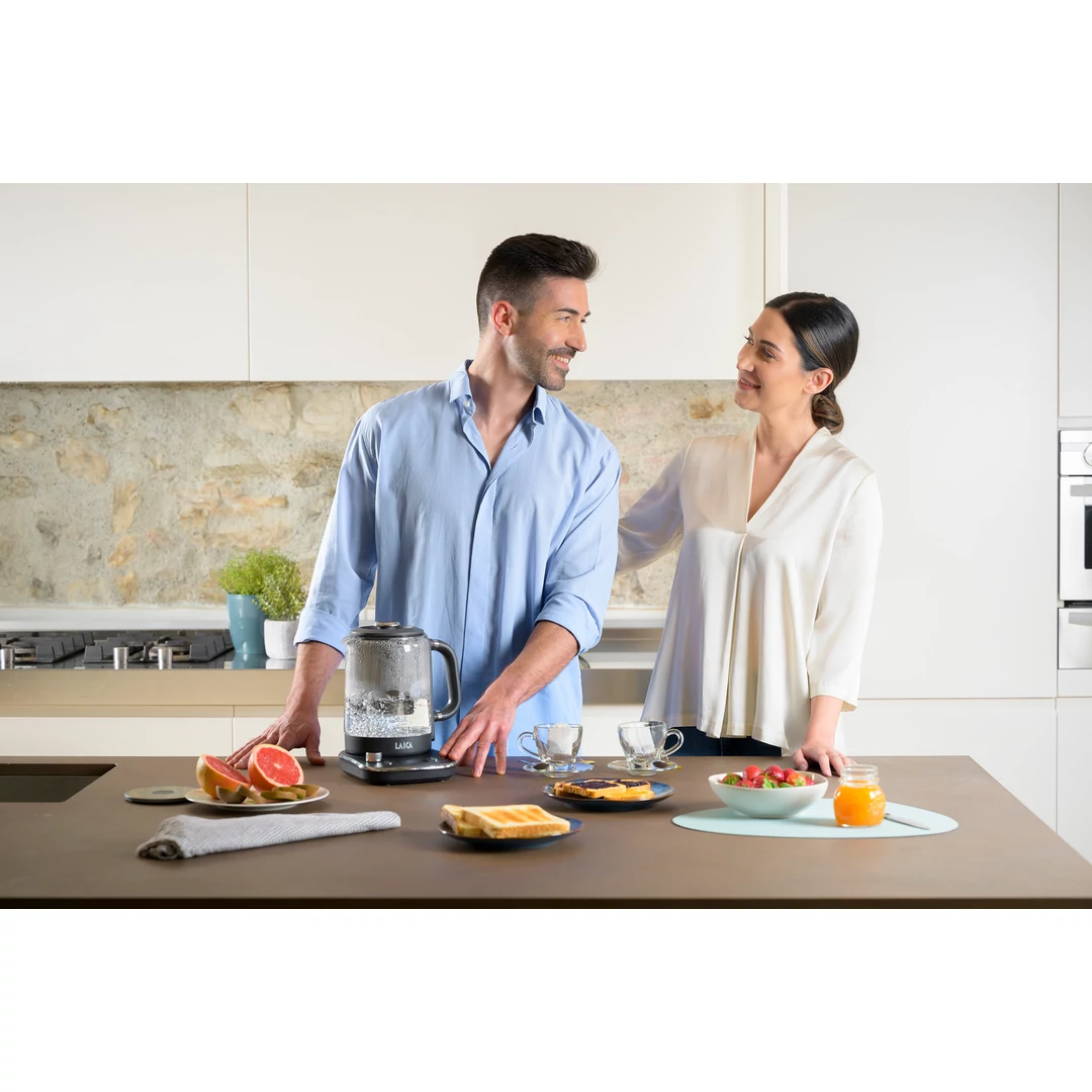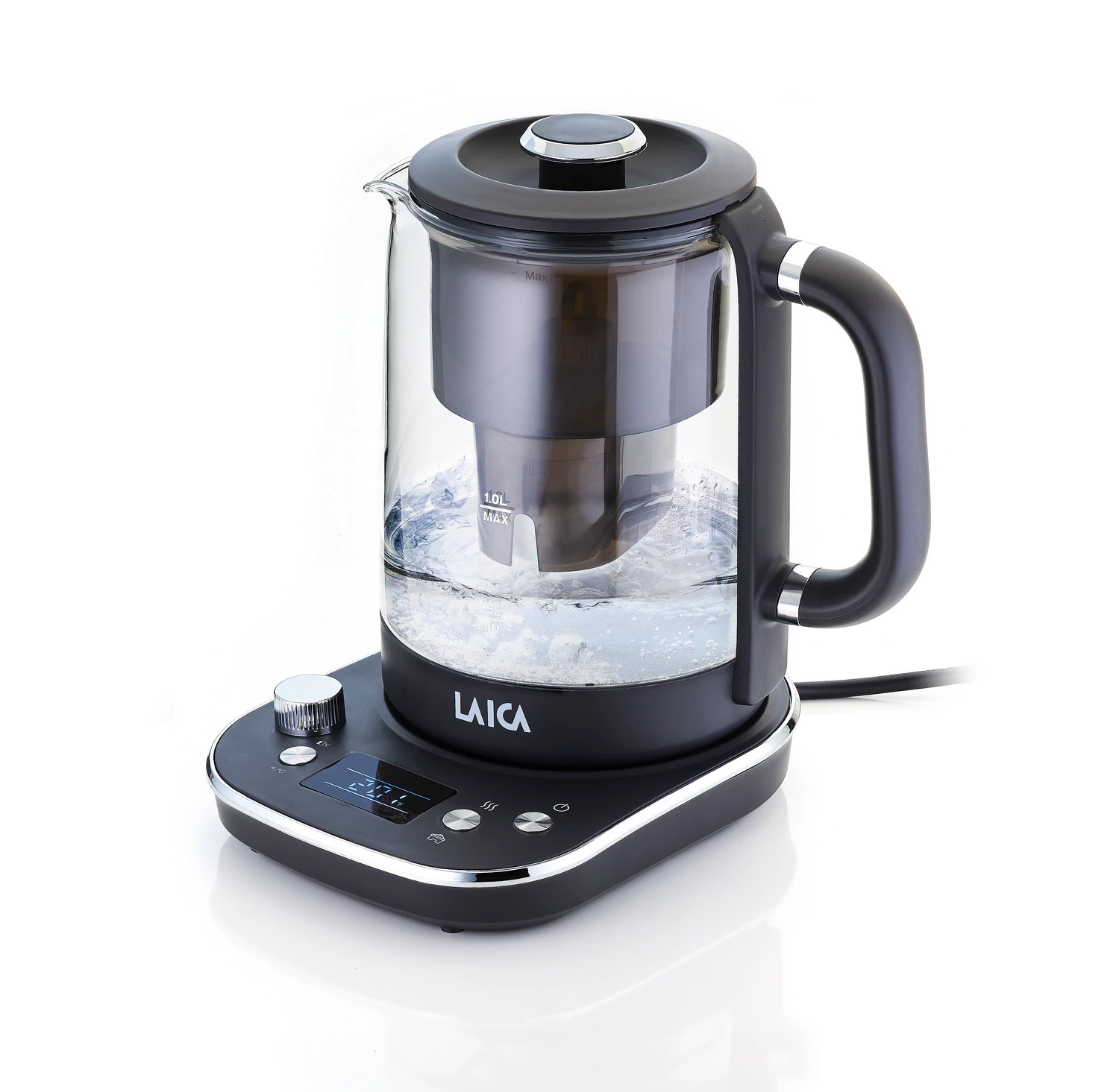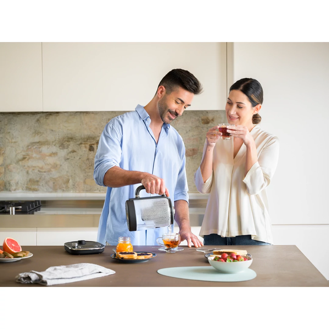 TERMÉK ÖSSZETEVŐI_ 1 elektromos vízforraló, 1 tápegység, 1 kávé és tea bi-flux szűrőbetét, 1 használati utasítás.